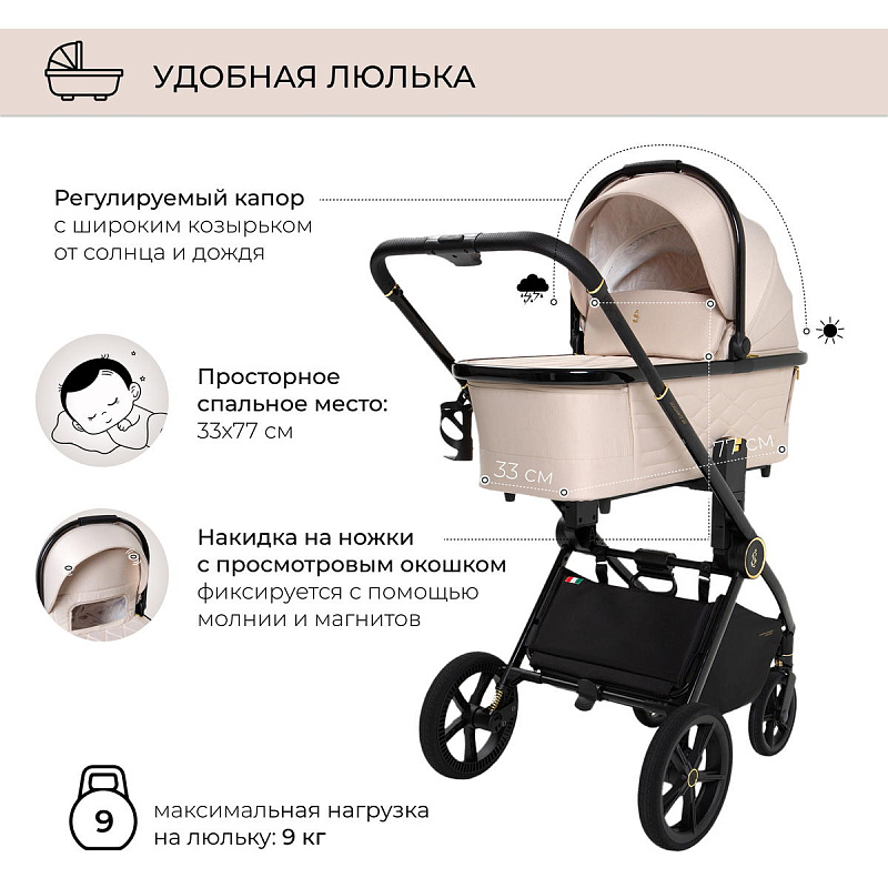 Уникальный дизайн коляски Sweet Baby Elegante привлекает внимание и вызывает восхищение. Аккуратный пошив и элегантные детали делают эту коляску по-настоящему стильным атрибутом для молодых родителей.