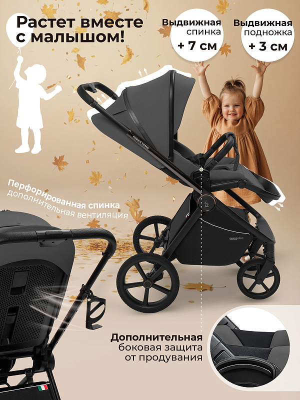 Уникальное термоактивное дно люльки поддерживает оптимальную температуру, позволяя вашему ребенку наслаждаться свежим воздухом и уютом даже в самые прохладные дни. Вентиляционные окошки для проветривания люльки оснащены утепленными вставками, которые легко отстегиваются при наступлении тепла, обеспечивая идеальный климат для вашего малыша. Обратите внимание на новые увеличенные колеса из высокомолекулярного полимера, аналогичных тем, что используются в кроссовках Nike. Эти колеса гарантируют отличную амортизацию и сцепление с различными покрытиями, что делает каждую прогулку плавной и комфортной. Даже на неровных поверхностях ваш малыш не почувствует ни малейшего дискомфорта, а родителям будет легко управлять коляской благодаря высокоэффективной амортизации как передних, так и задних колес.
