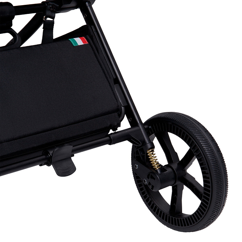 Большие не надувные колёса с амортизаторами обеспечивают плавность хода и хорошую проходимость на разных поверхностях.
