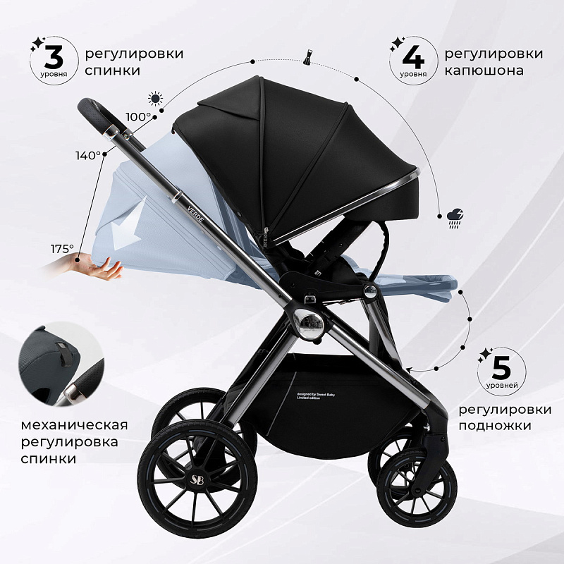 Коляска 2 в 1 для новорожденных Sweet Baby Verde - отличный выбор для комфортных прогулок с вашим малышом! Большая высокая люлька, стильное глянцевое шасси, просторный регулируемый прогулочный блок делают коляску Sweet Baby Verde максимально комфортной для пользования. Коляска подойдет для детей от 0 до 4 лет или до достижения 22 кг .