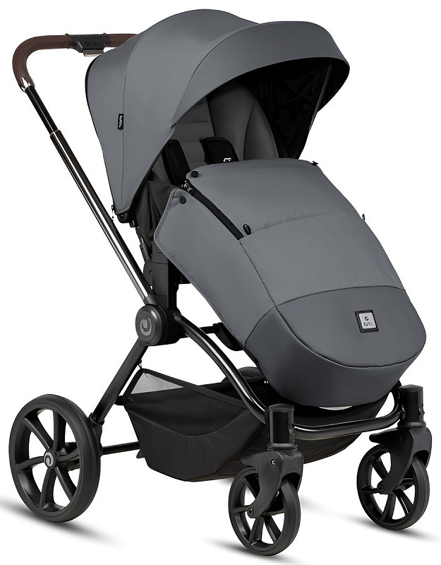 Ручка коляски покрыта мягкой экокожей и регулируется телескопически, чтобы подстроиться под разный рост родителей. Тормозная система выполнена в виде двусторонней педали, которая не пачкает вашу обувь. Вместительная корзина для покупок с сетчатыми бортиками легко доступна независимо от положения спинки сиденья.