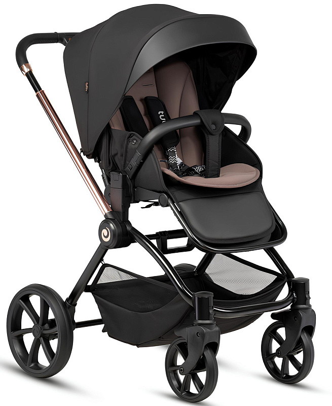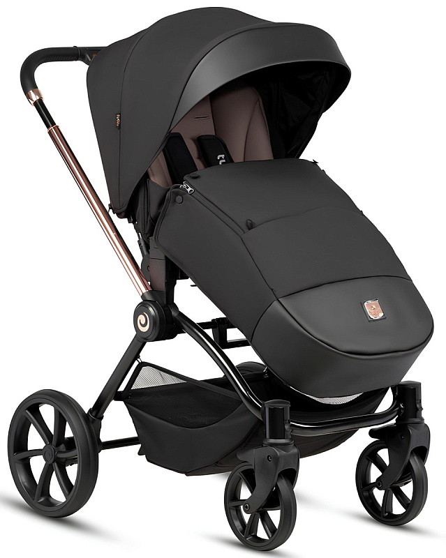 Ручка коляски покрыта мягкой экокожей и регулируется телескопически, чтобы подстроиться под разный рост родителей. Тормозная система выполнена в виде двусторонней педали, которая не пачкает вашу обувь. Вместительная корзина для покупок с сетчатыми бортиками легко доступна независимо от положения спинки сиденья.