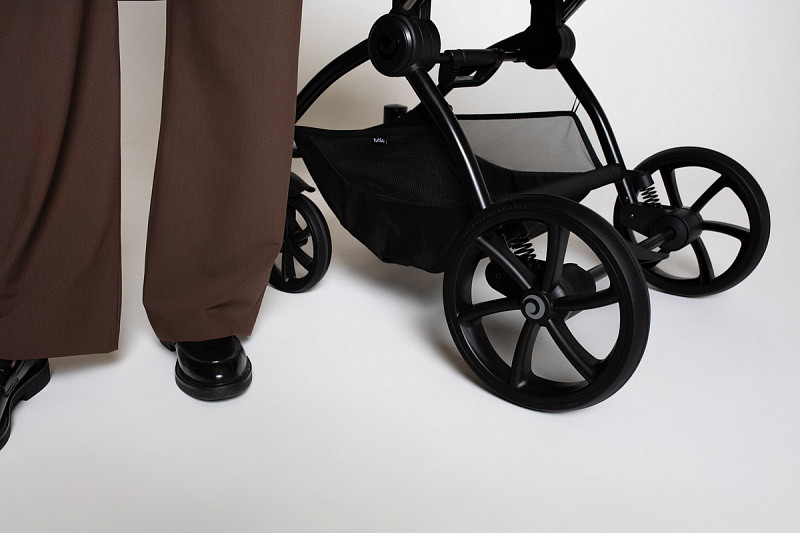 Гелевые колеса Tutis Gio+ устойчивы к проколам и обеспечивают мягкое движение на любой поверхности. Они легко справляются даже с труднопроходимыми участками. Пружинная амортизация сглаживает вибрации, создавая комфорт как для малыша, так и для родителей. Для передвижения по снегу или песку передние поворотные колеса можно зафиксировать в прямом положении.