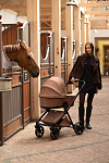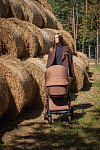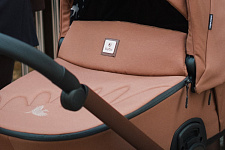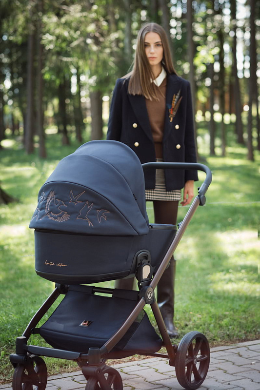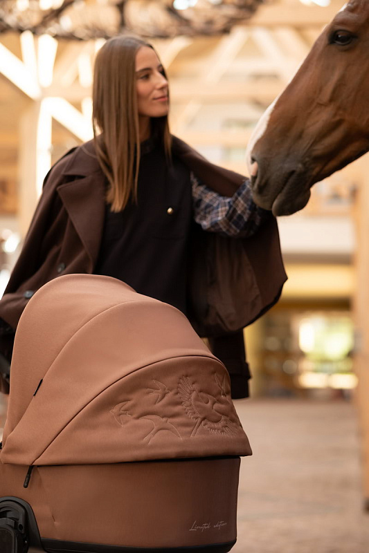 Теплая коляска в землистых тонах украшена изысканной вышивкой с изображением удода – символа гармонии, мудрости и неиссякаемой энергии.