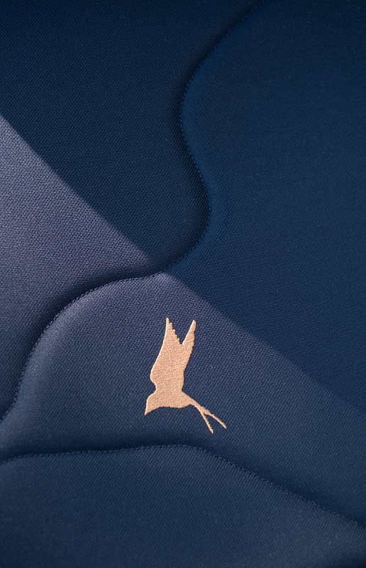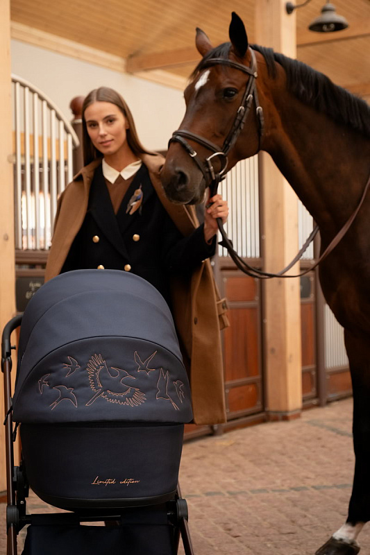 Окутанная глубоким полночным синим, как бездонное ночное небо, эта коляска несет на себе вышитую ласточку, символ надежды.