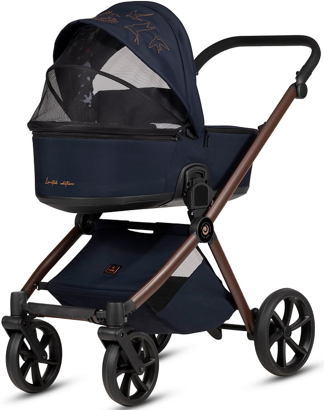 Окутанная глубоким полночным синим, как бездонное ночное небо, эта коляска несет на себе вышитую ласточку, символ надежды.