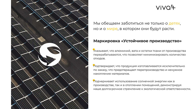 Подчеркивает использование солнечной энергии как в производстве, так и в отоплении помещений, демонстрируя наше долгосрочное стремление к экологической ответственности.