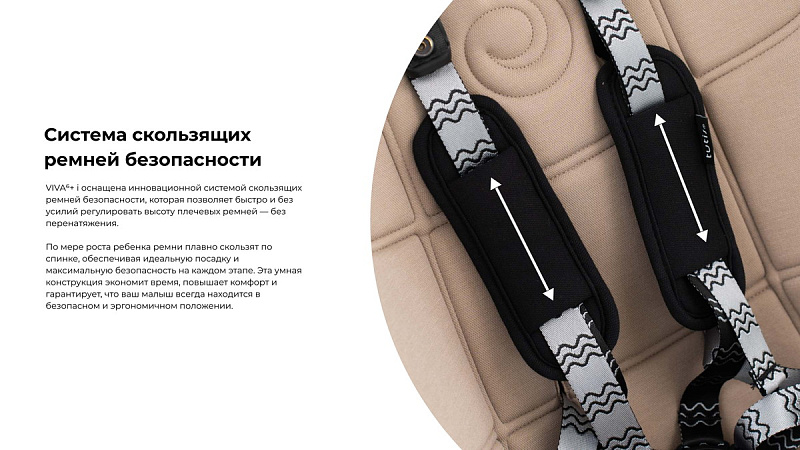 VIVA6+ оснащена инновационной системой скользящих ремней безопасности, которая позволяет быстро и без усилий регулировать высоту плечевых ремней — без перенатяжения.