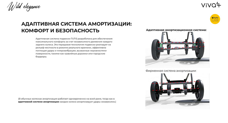 Адаптивная система подвески TUTIS разработана для обеспечения максимального комфорта за счет независимого движения каждого заднего колеса. Эта передовая технология подвески реагирует на рельеф местности в режиме реального времени, эффективно поглощая удары и микровибрации, вызванные неровностями поверхности, такими как гравийные дорожки или городские бордюры.