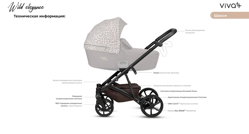 Детская коляска Tutis Viva 6 Plus Wild Elegance 3 в 1 с автокреслом Beno Black Wild MoccaНет оценокХарактеристики