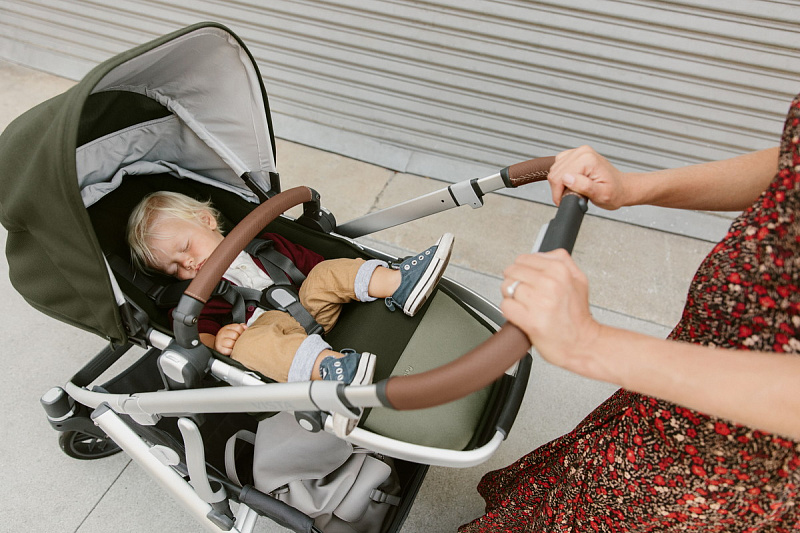 Ручка регулируется по высоте для удобства использования родителями любого роста. Накладка на ручку выполнена из высококачественной натуральной кожи, поэтому обеспечивает надежный хват и легкий уход.