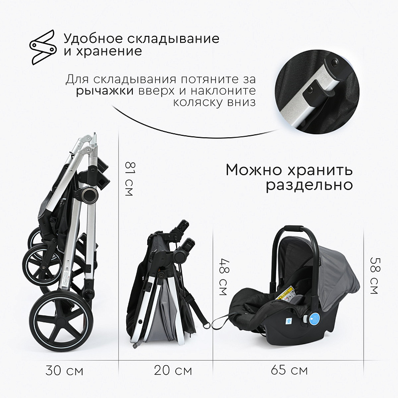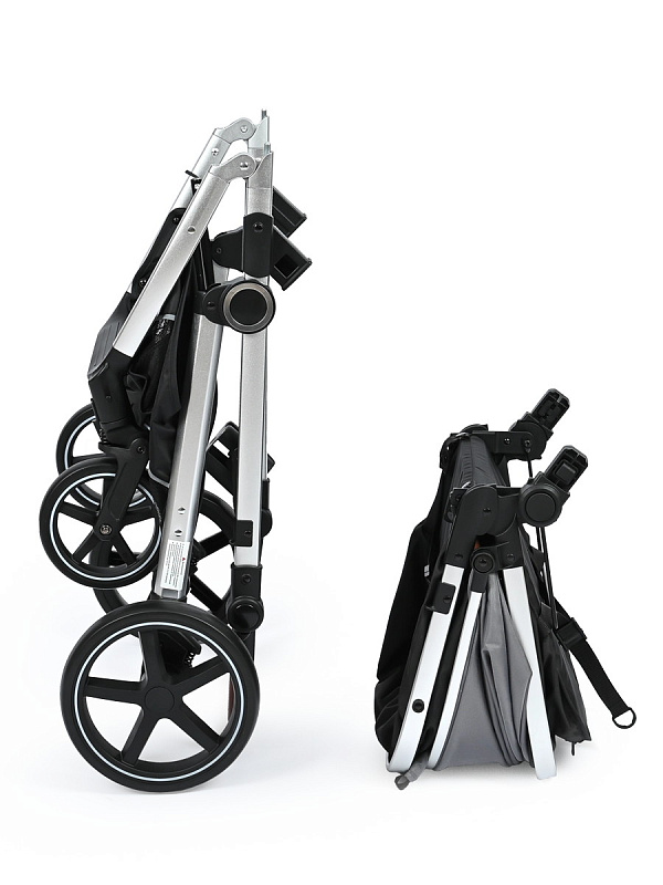 Коляска компактно складывается с сиденьем или без него.