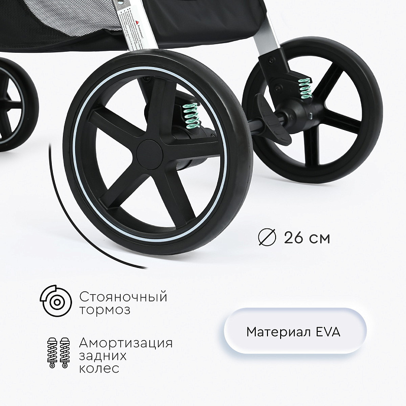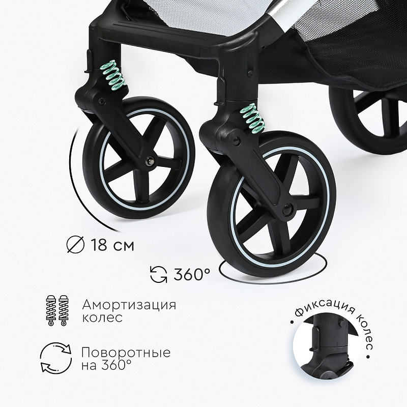 Амортизация передних и задних колес обеспечивает плавный ход коляски.