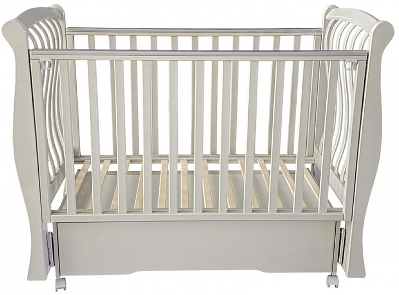 Модель имеет съемную переднюю стенку с механизмом автостенки, что упрощает доступ к ребенку. Реечное ложе регулируется по высоте, позволяя адаптировать кроватку под растущего ребенка. Вместительный закрытый ящик обеспечивает дополнительное место для хранения постельных принадлежностей и детских аксессуаров.
