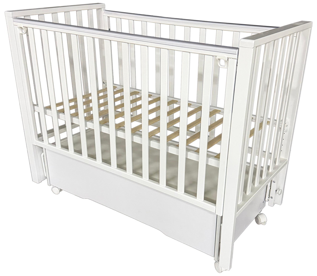 Реечное ложе с двумя уровнями высоты растёт вместе с ребёнком, обеспечивая комфорт и безопасность на каждом этапе развития. Съемная передняя стенка с двумя положениями позволяет легко укладывать и доставать малыша, бережно охраняя его сон.
