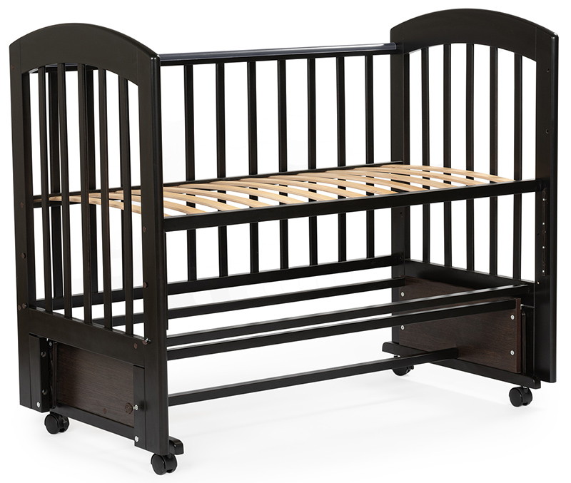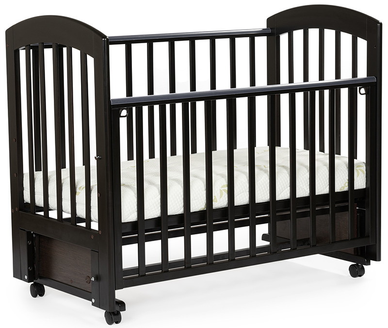 - кроватка имеет четыре поворотных колёса, для перемещения кроватки в комнате, для установки в неподвижном положении на двух из них имеются стопоры