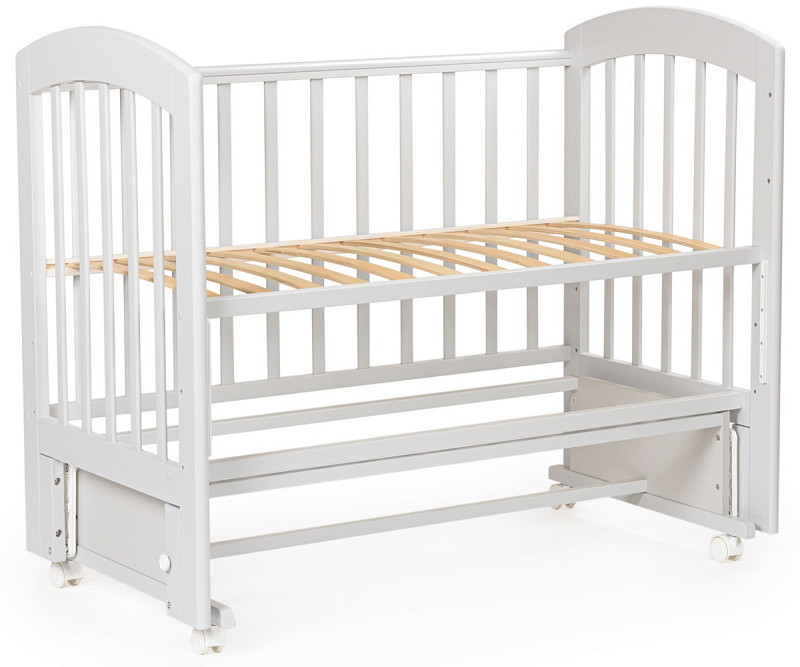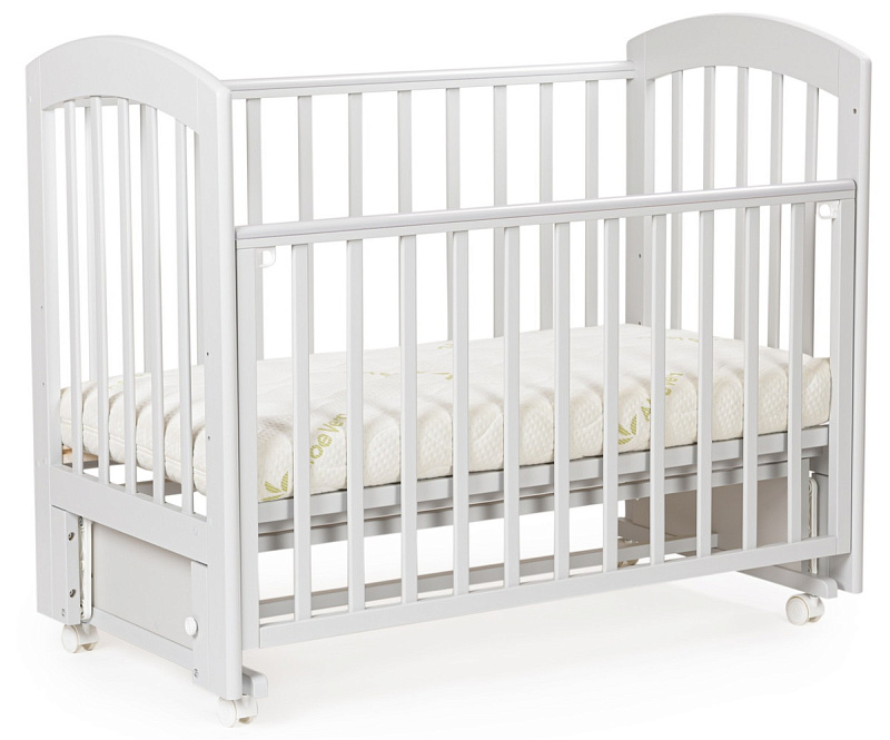 - кроватка имеет четыре поворотных колёса, для перемещения кроватки в комнате, для установки в неподвижном положении на двух из них имеются стопоры