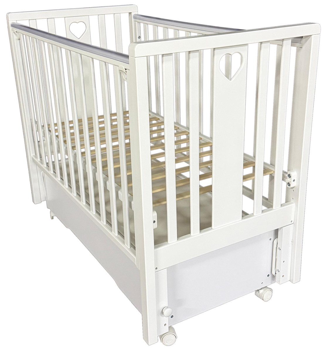 Реечное ложе с двумя уровнями высоты растёт вместе с ребёнком, обеспечивая комфорт и безопасность на каждом этапе развития. Съемная передняя стенка с двумя положениями позволяет легко укладывать и доставать малыша, бережно охраняя его сон.