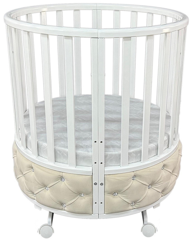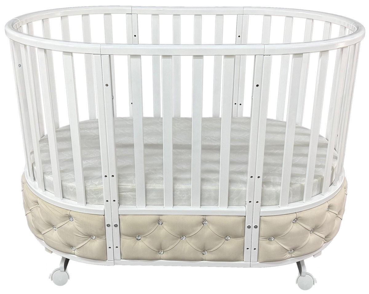 Кроватка овальной формы с мягкой обивкой по нижнему краю. Укомплектована универсальным маятником с функцией продольного или поперечного качания. Маятниковый механизм можно зафиксировать и использовать кроватку, как качалку или поставить на ножки. Имеет съемное переднее ограждение. Реечное ложе регулируется по высоте в трех положениях. Варианты сборки: круглая и овальная кроватка, манеж, 2 стульчика, столик, диванчик.