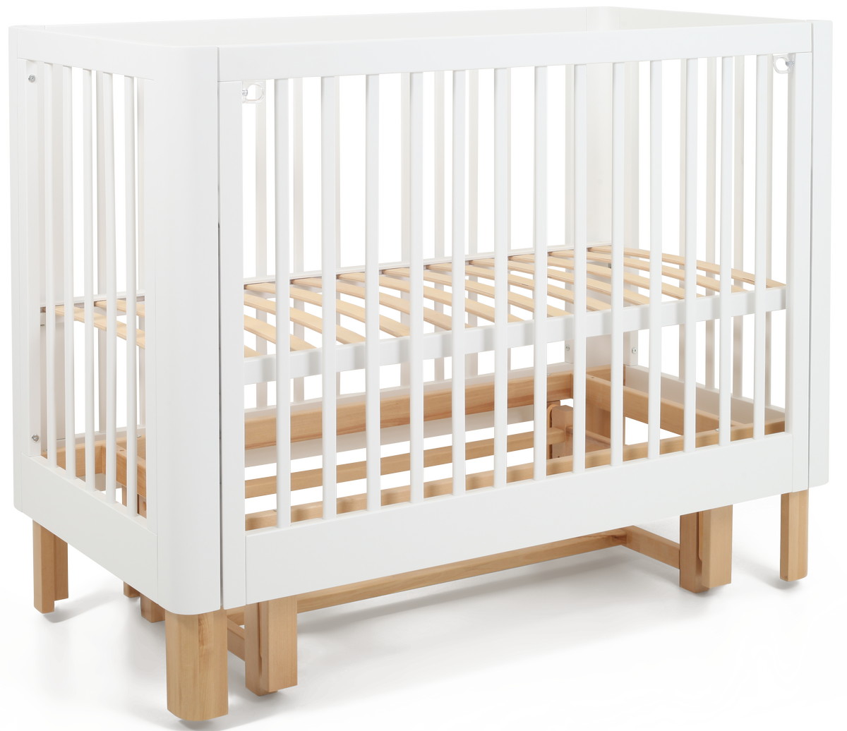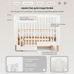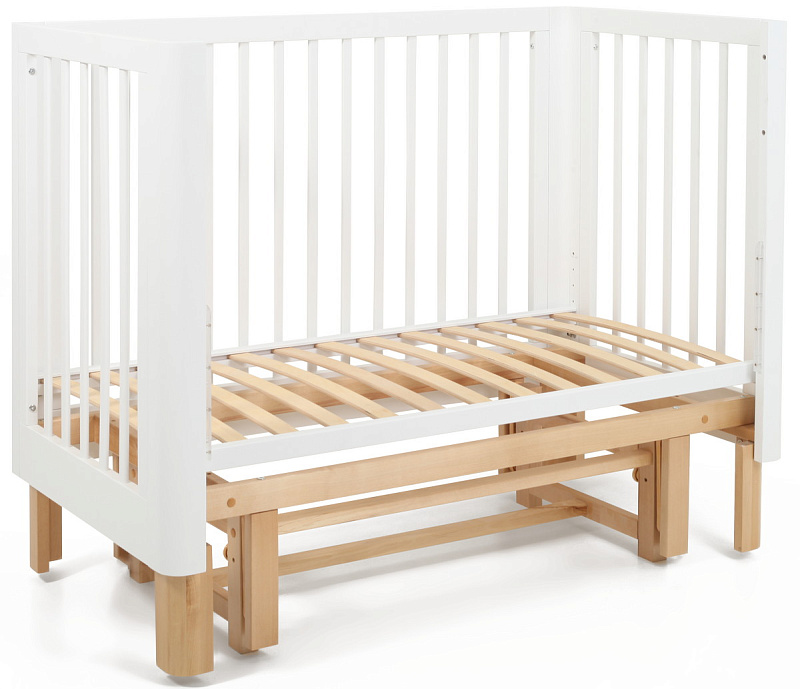чтобы обеспечить спокойный сон маме и малышу, боковое ограждение можно легко снять нажатием двух кнопок (курковый механизм) и придвинуть кроватку к кровати родителей, а когда кроха подрастет кроватка превращается в уютный диванчик