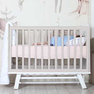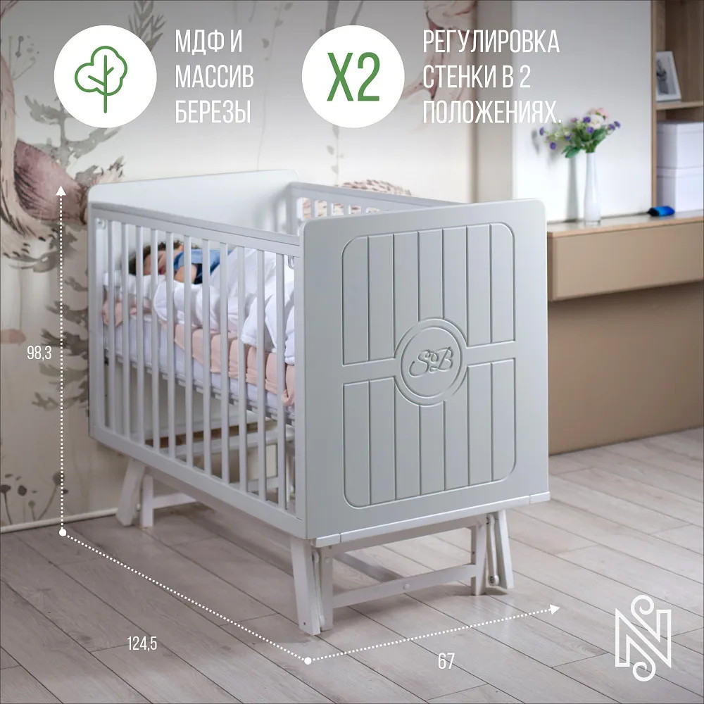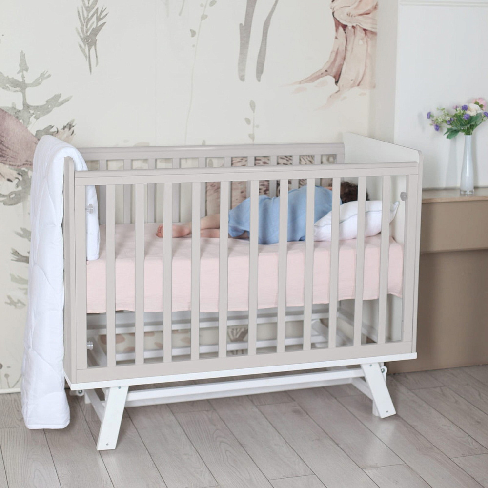 Бесшумный продольный маятник кроватки блокируется, когда это необходимо. Когда ребенок подрастет можно снять маятник и установить кроватку на ножки,