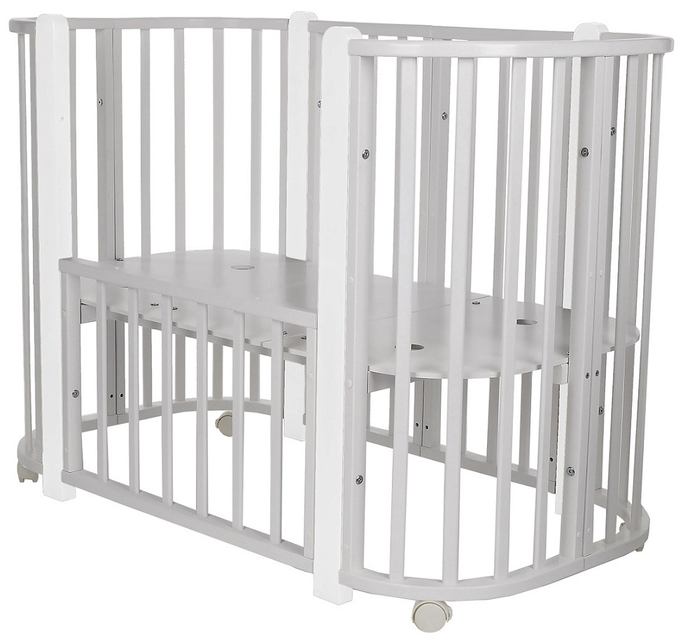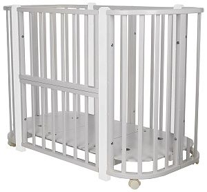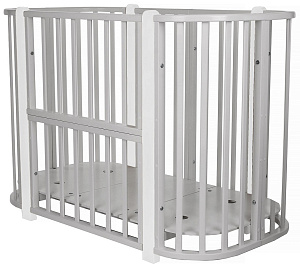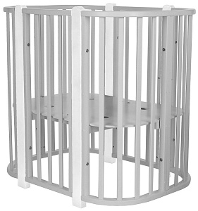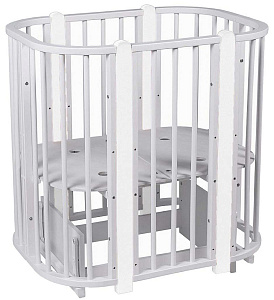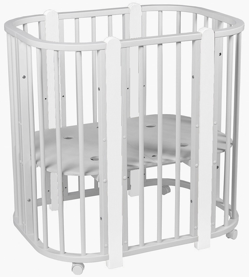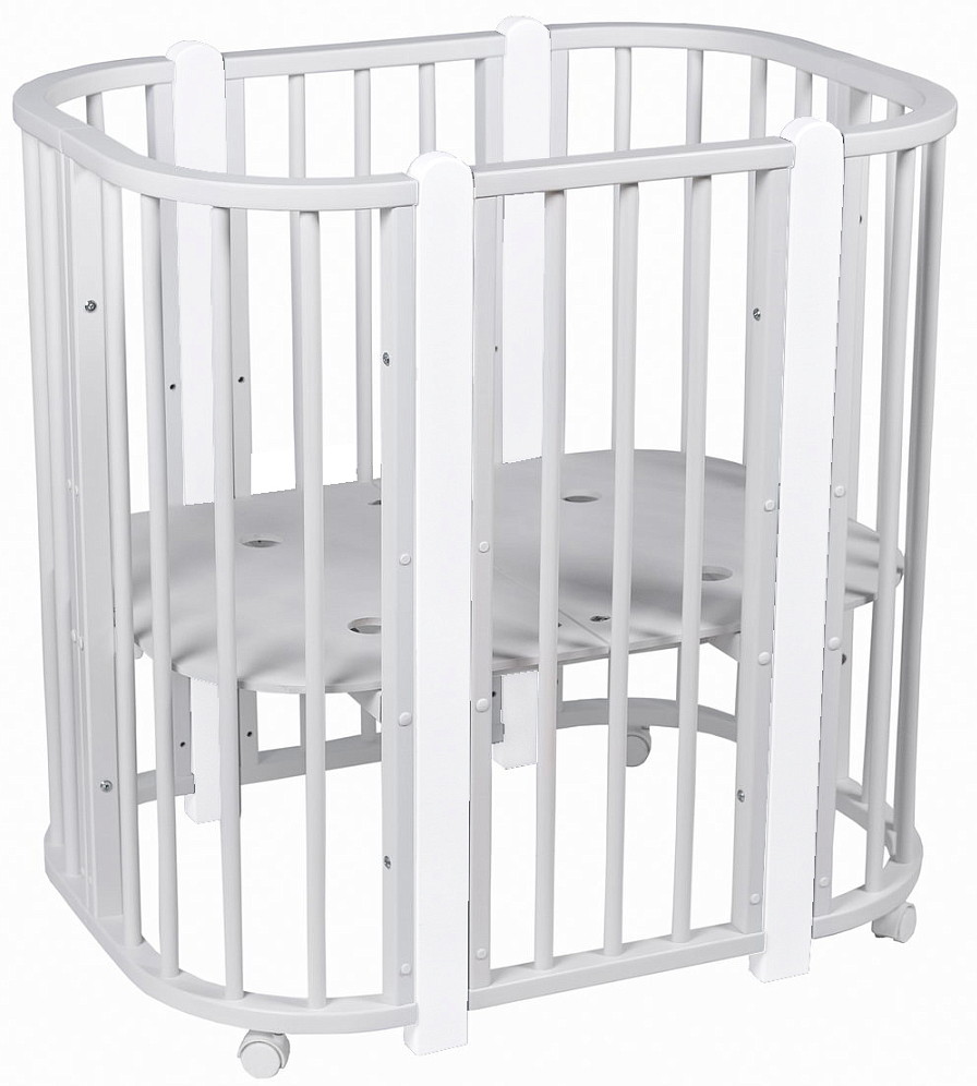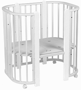 Современная кроватка необычной овальной формы для ребенка с рождения до 3 лет. Уже доказано, что ребенок в первые месяцы после рождения лучше спит в небольшом ограниченном пространстве, там более уютно и спокойно. В этот период рекомендуем использовать колыбель. В дальнейшем кроватка трансформируется в полноценную овальную кроватку с закругленными углами. У кроватки простой, но очень красивый внешний вид. Она полностью безопасна для ребенка и не имеет острых углов. В комплекте с кроваткой идут колёса для удобного перемещения по комнате. Кроватка проходит в стандартный дверной проём.