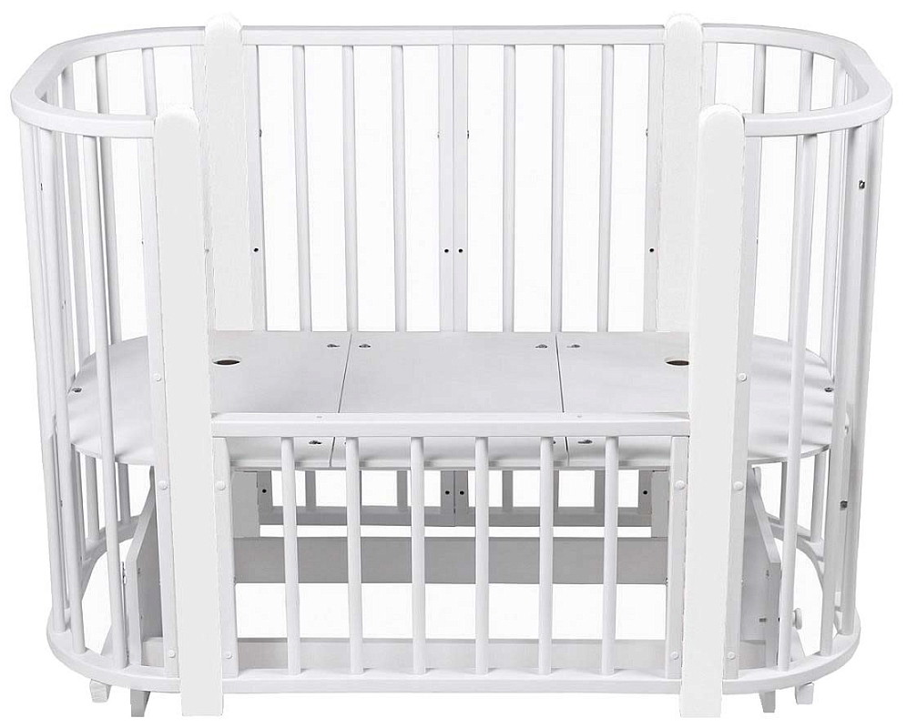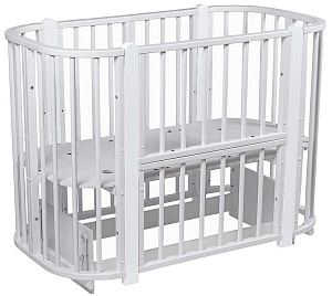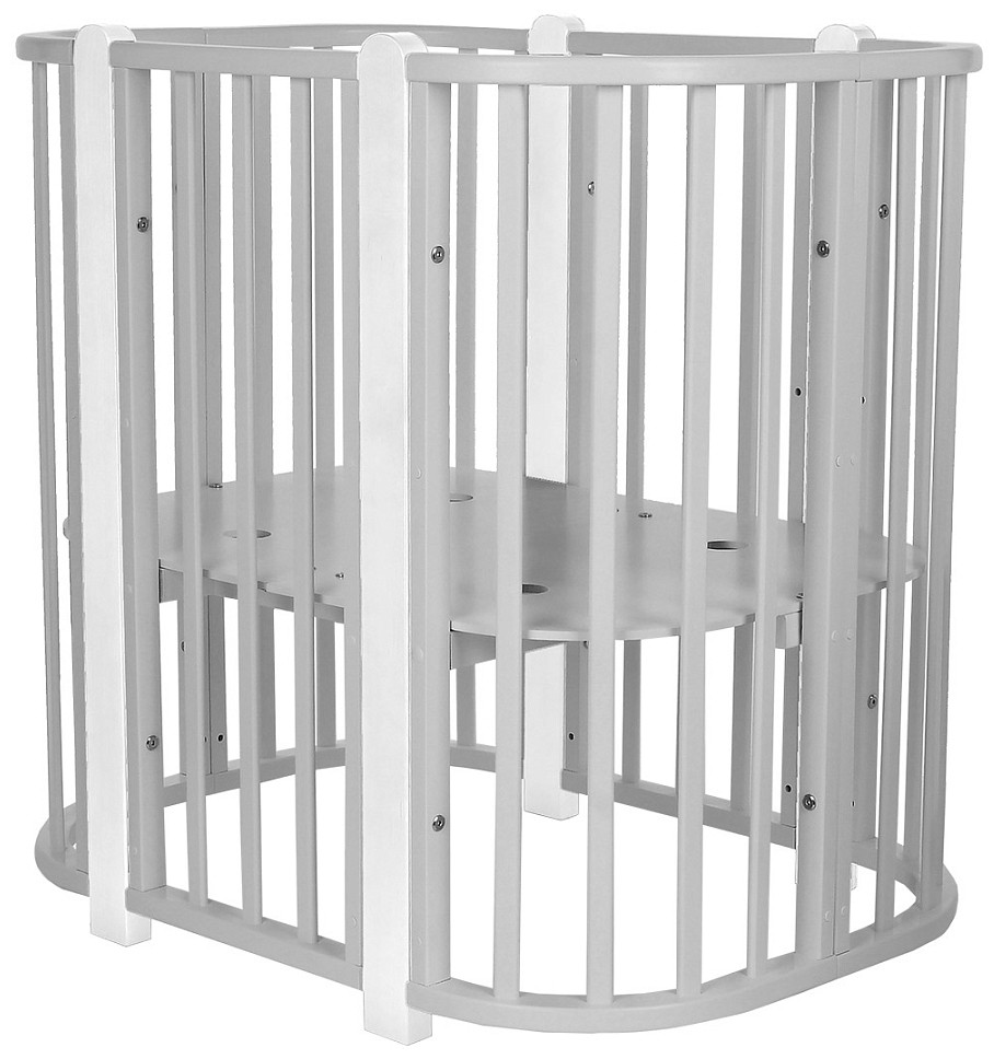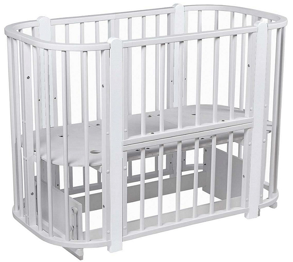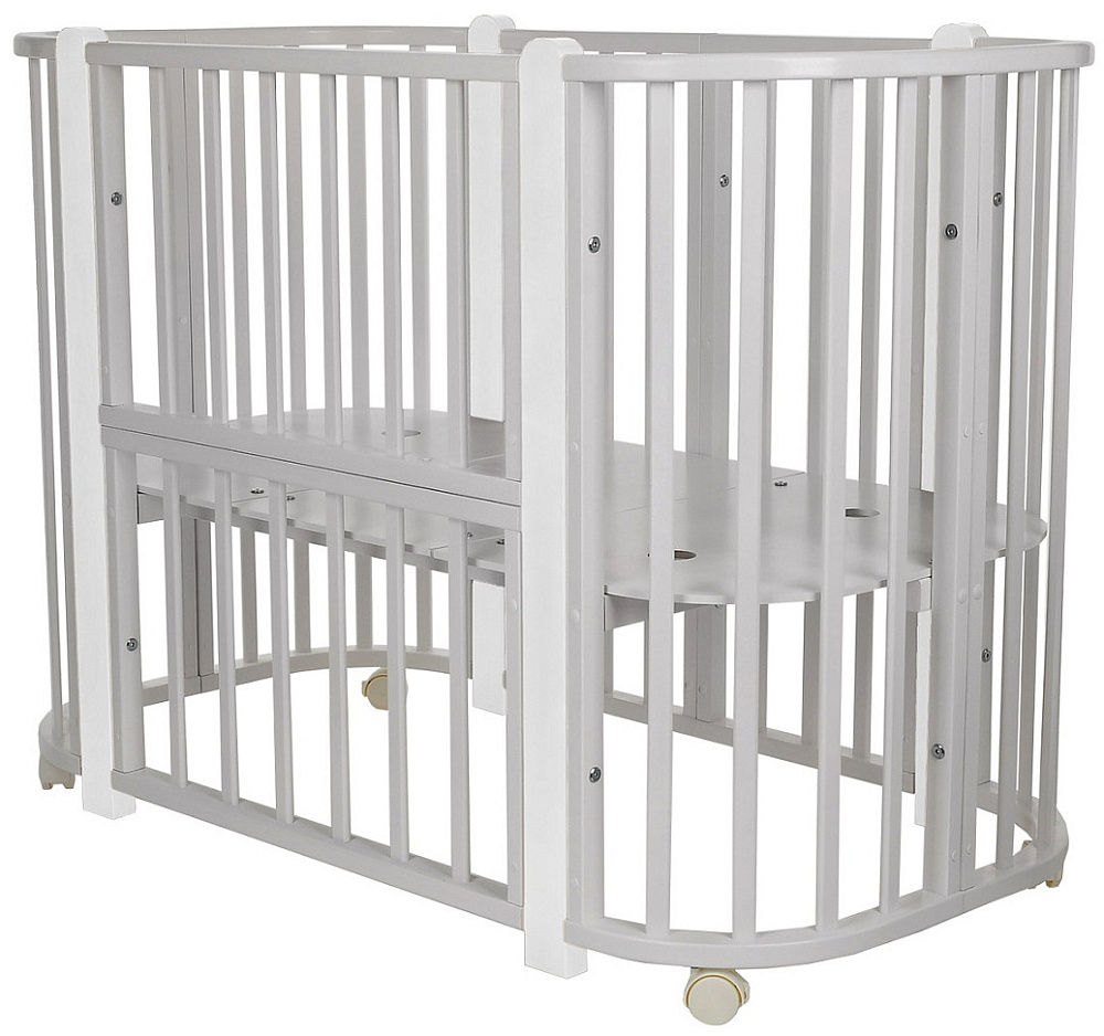 Современная кроватка необычной овальной формы для ребенка с рождения до 3 лет. Уже доказано, что ребенок в первые месяцы после рождения лучше спит в небольшом ограниченном пространстве, там более уютно и спокойно. В этот период рекомендуем использовать колыбель. В дальнейшем кроватка трансформируется в полноценную овальную кроватку с закругленными углами. У кроватки простой, но очень красивый внешний вид. Она полностью безопасна для ребенка и не имеет острых углов. В комплекте с кроваткой идут колёса для удобного перемещения по комнате. Кроватка проходит в стандартный дверной проём.
