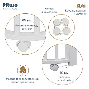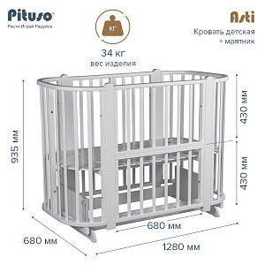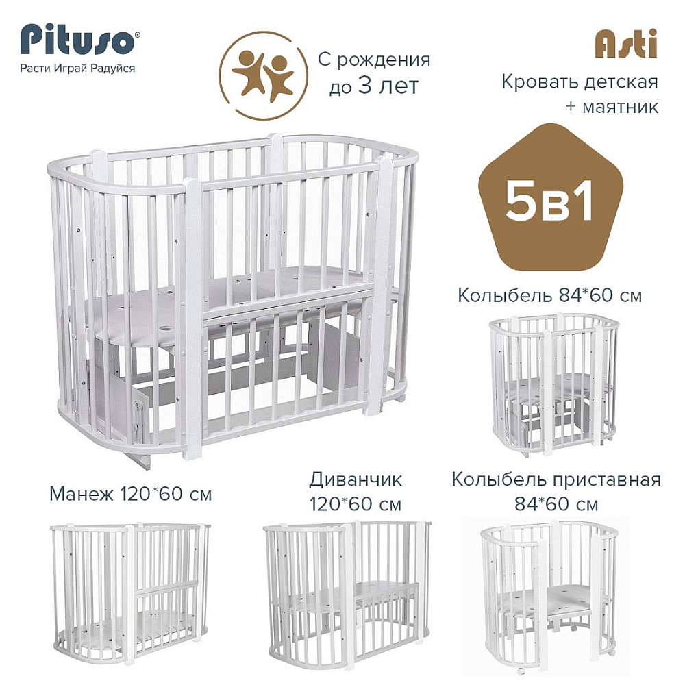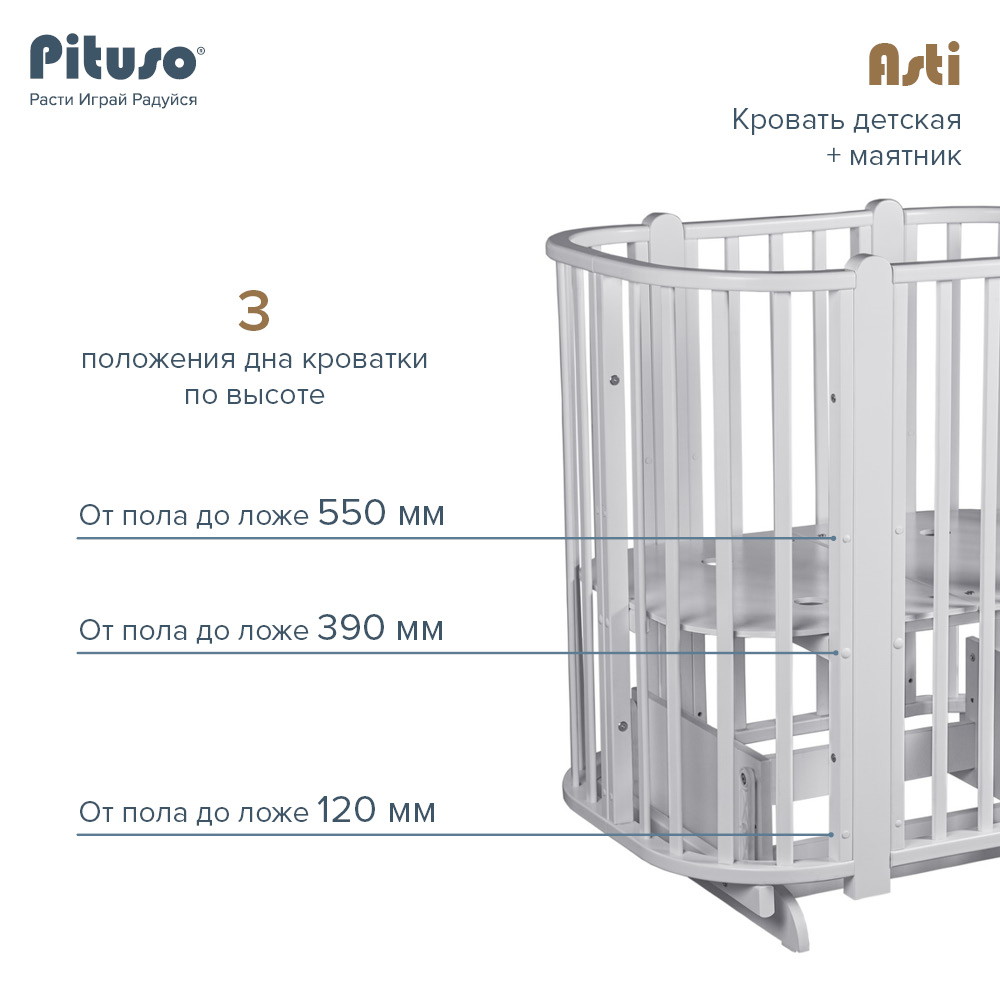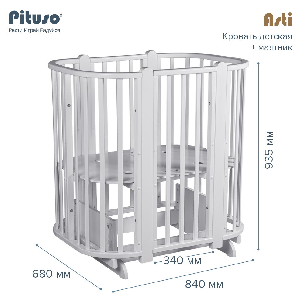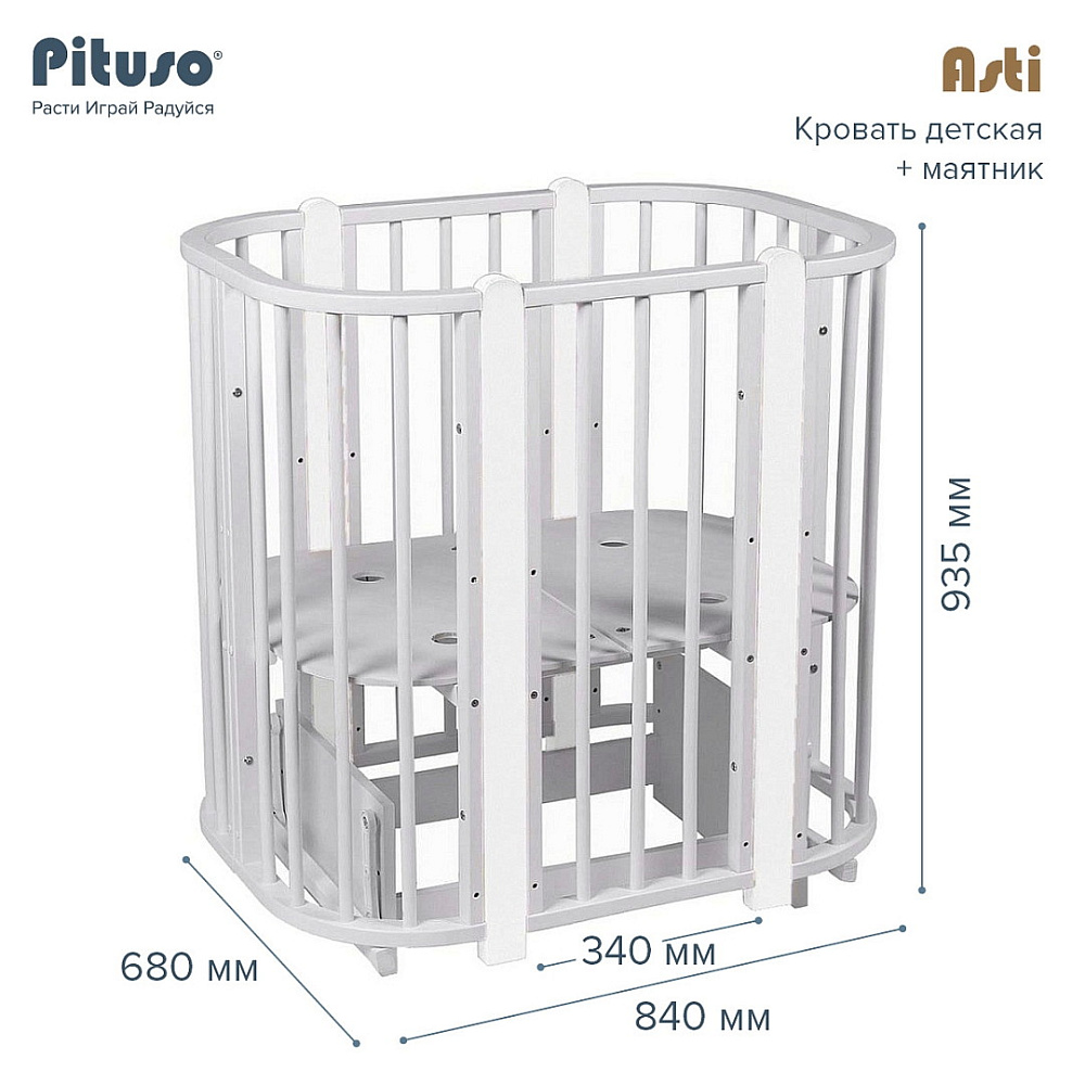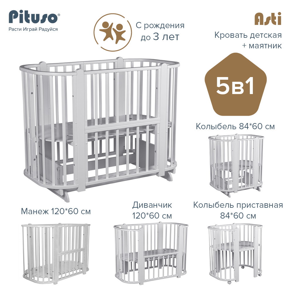 Детская кроватка-трансформер овальная Pituso Asti + маятник 5 в 1 Серый-БелыйНет оценокХарактеристики