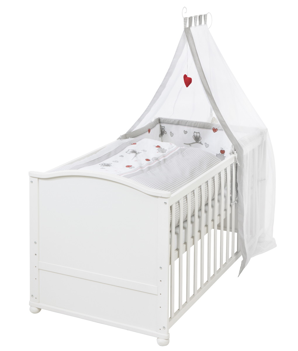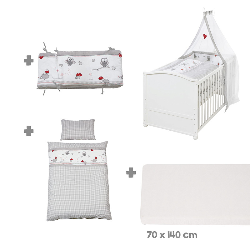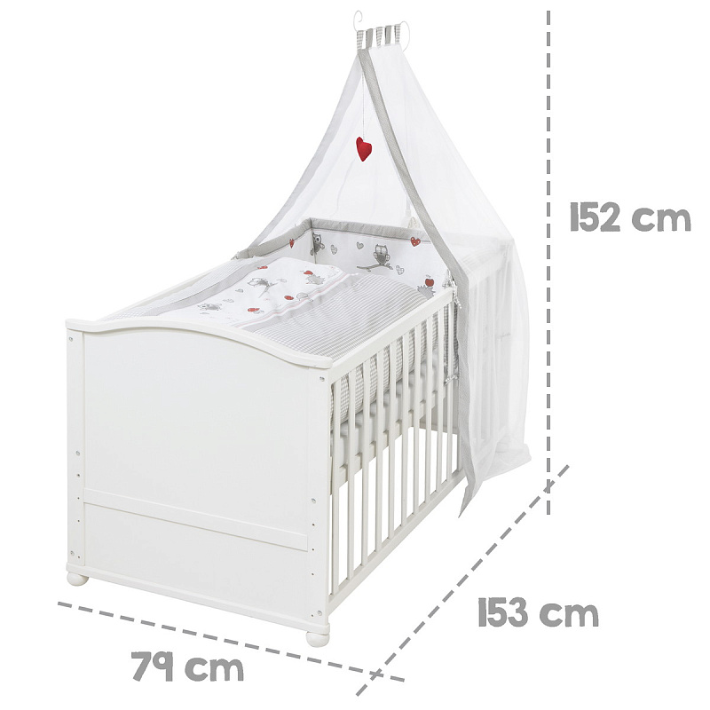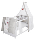 Кровать-трансформер Lukas в полной комплектации Adam & Owl включает в себя раскладную детскую кроватку, комплект постельного белья, мягкий бампер, матрас (70 х 140 см) и балдахин.