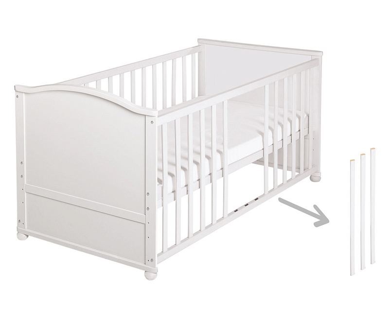 Кровать трансформируется благодаря дополнительным боковым рейкам и подходит детям от самого рождения до 7 лет.