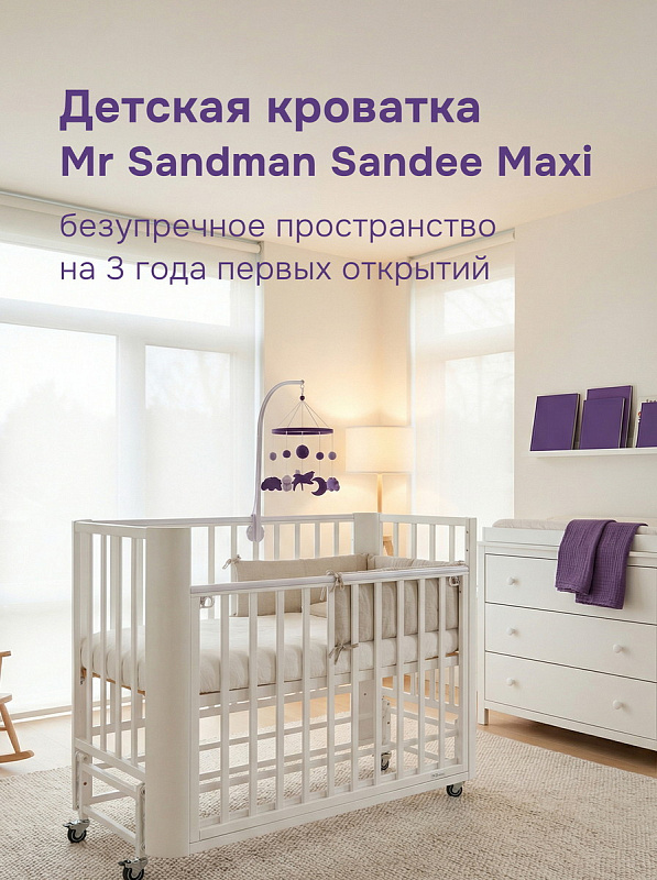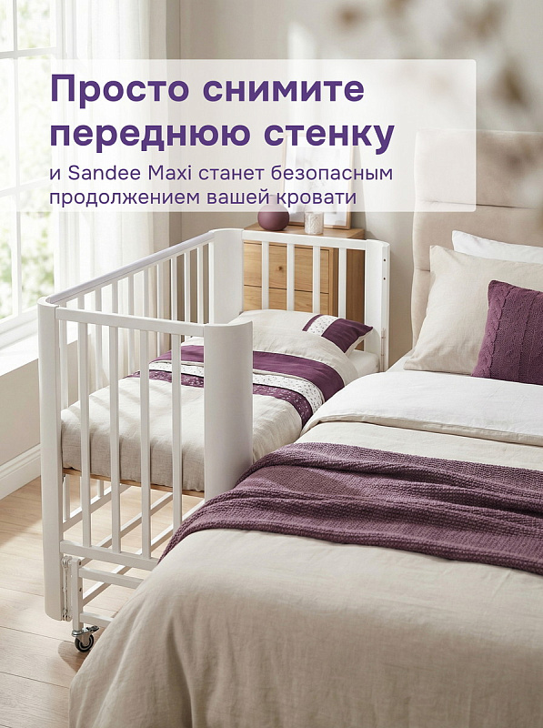 Детская приставная кровать для новорожденных Mr Sandman Mr Sandee Maxi с продольным маятником - выполнена из прочного и долговечного массива бука, имеет широкий функционал, комфорт и абсолютную безопасность для малыша. Детская кроватка оборудована специальными ремнями, которые надежно крепятся к родительской кровати и обеспечат максимальную безопасность малышу, а маме не придется вставать ночью для кормления. У кровати закруглены углы и края, тщательно рассчитано безопасное расстояние между рейками. Ложе кроватки выполнено из высокопрочной и влагостойкой лиственницы.