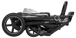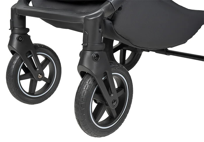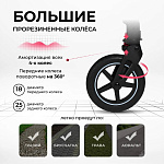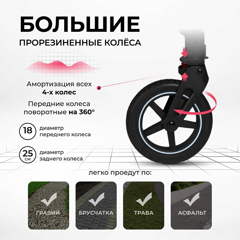 2. Большие прорезиненные колеса являются износостойкими и легкими, не боятся проколов. Они не требуют подкачки и обеспечивают прекрасную маневренность на любом покрытии дороги. Диаметр передних колес составляет 18 см, а задних - 25 см. Передние колеса поворотные на 360° и имеют функцию фиксации направления движения. Кроме того, все колеса съемные. Для дополнительного комфорта и маневренности коляска оснащена амортизацией всех 4 колес.