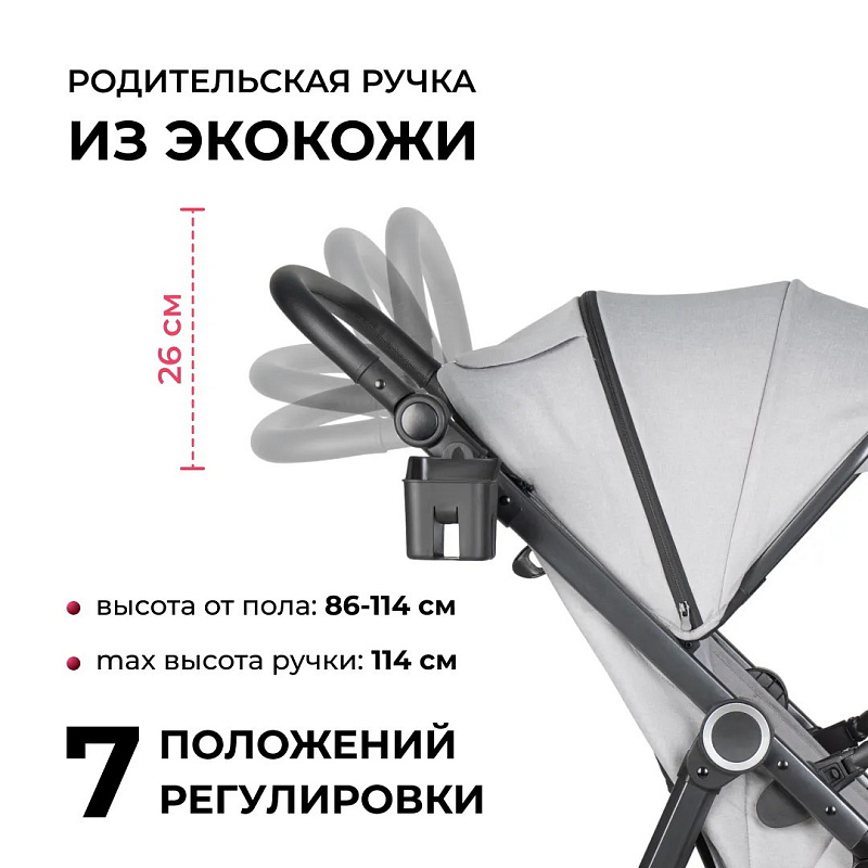 6. Родительская ручка регулируется по высоте в 7 положениях с максимальной высотой 114 см. Она выполнена из практичной экокожи.
