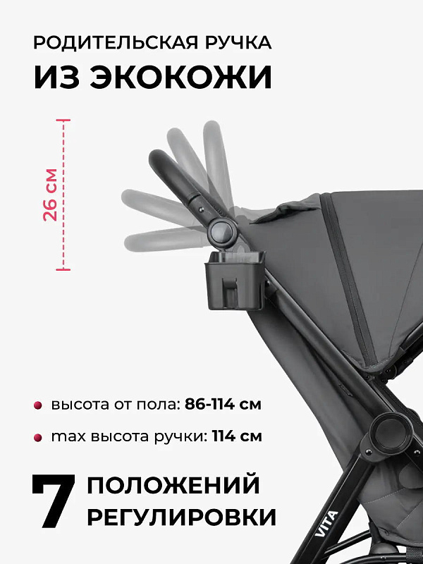 6. Родительская ручка регулируется по высоте в 7 положениях с максимальной высотой 114 см. Она выполнена из практичной экокожи.
