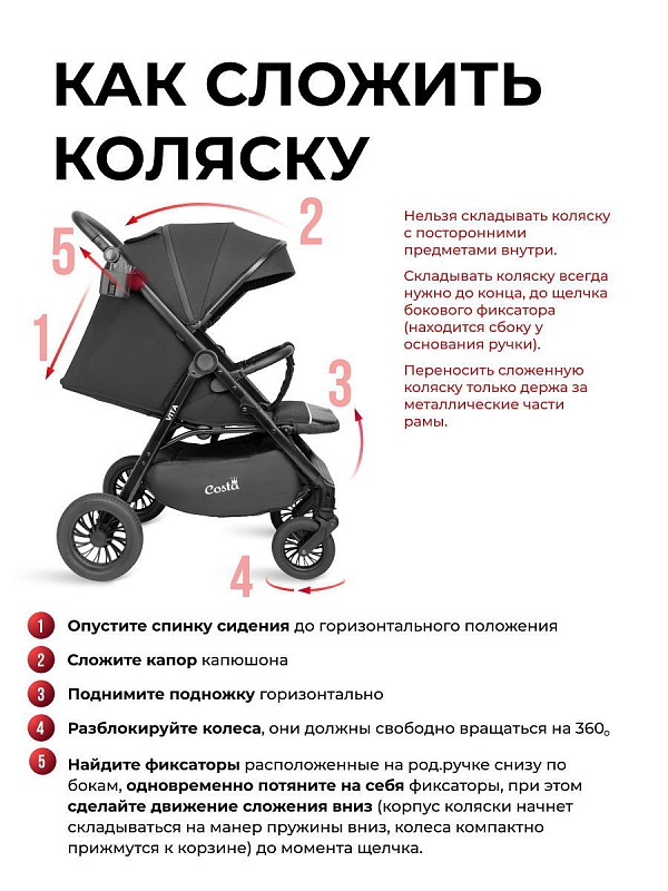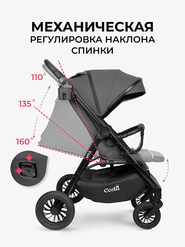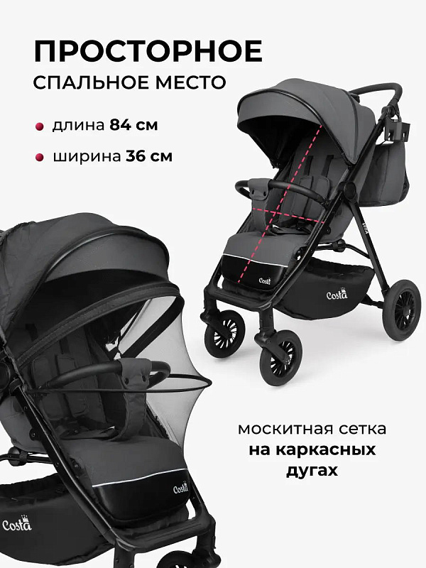 Прогулочная коляска Costa Vita - это идеальное решение для тех, кто ищет надежную, удобную и функциональную коляску для прогулок с малышом. Благодаря своим особенностям и характеристикам, она обеспечивает комфорт и безопасность для вашего ребенка в любое время года.