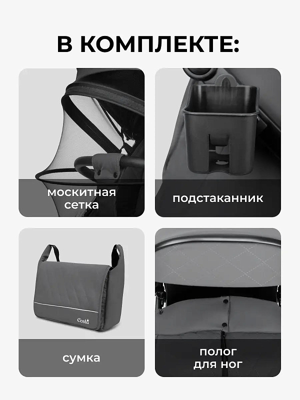 В комплекте с коляской идёт подстаканник, вместительная и функциональная сумка для мамы, москитная сетка и утеплённая накидка для ног. Таким образом, родителям не придется дополнительно приобретать эти аксессуары, все уже входит в комплект.