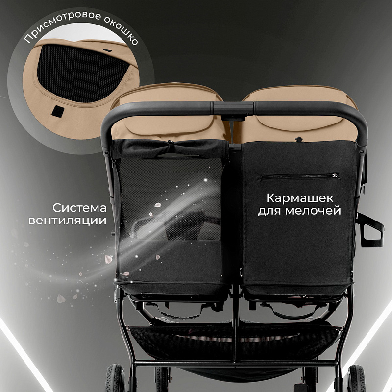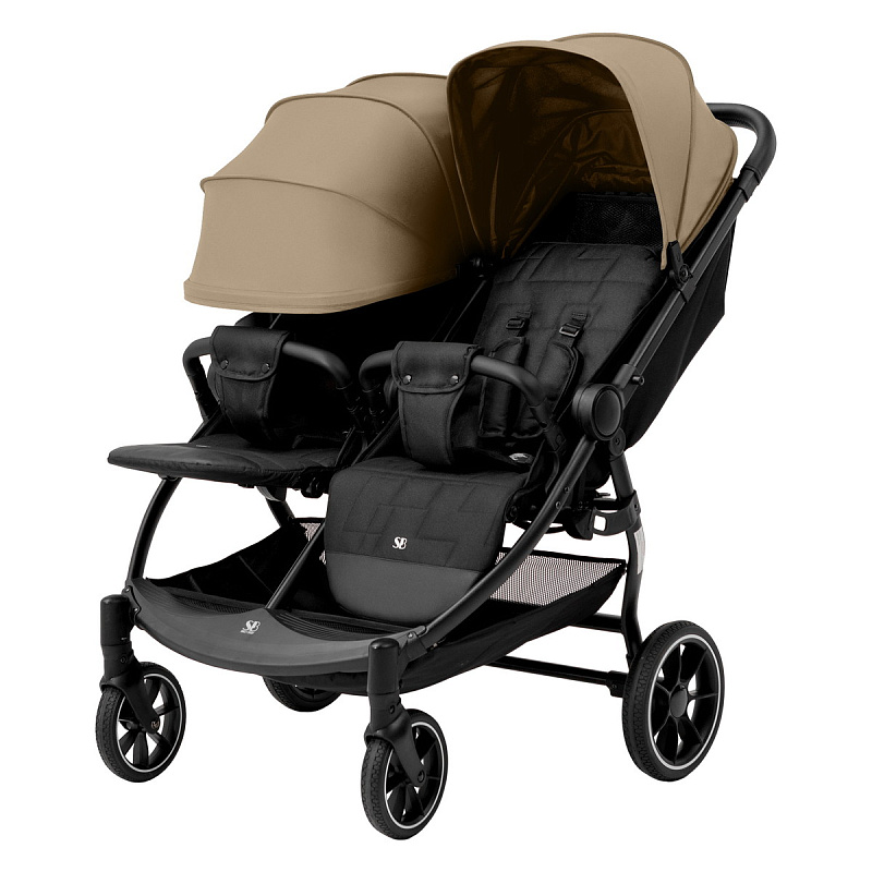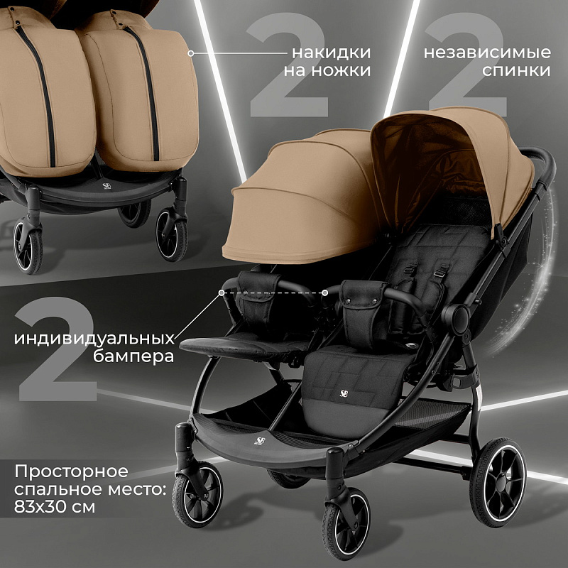 - Рама коляски оснащена двумя сиденьями с индивидуальными системами регулировки, что обеспечивает максимальный комфорт во время поездок с двумя малышами.