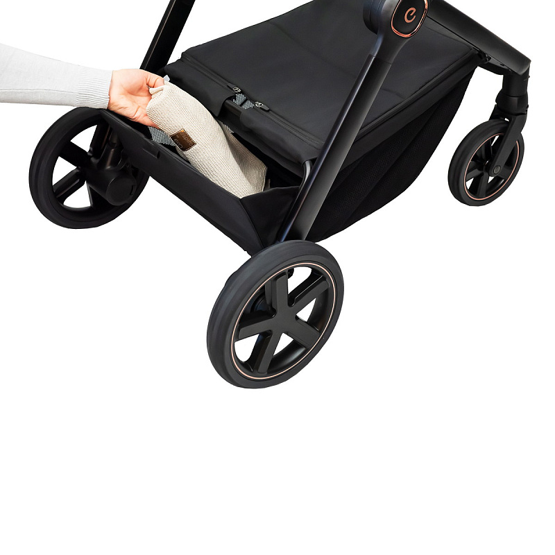 - Компактное складывание. Шасси складывается вместе с прогулочным блоком. Боковой замок-фиксатор гарантирует, что коляска не раскроется при переноске или погрузке в багажник.