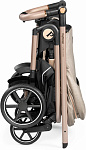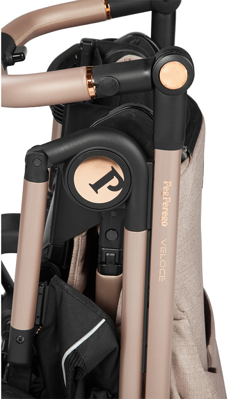 Прогулочная коляска Veloce складывается и раскладывается всего одной рукой с помощью специальной централизованной системы складывания, расположенной на ручке. В сложенном виде занимает очень мало места, и сама стоит без опоры, не пачкая ручку и тканевую обивку.