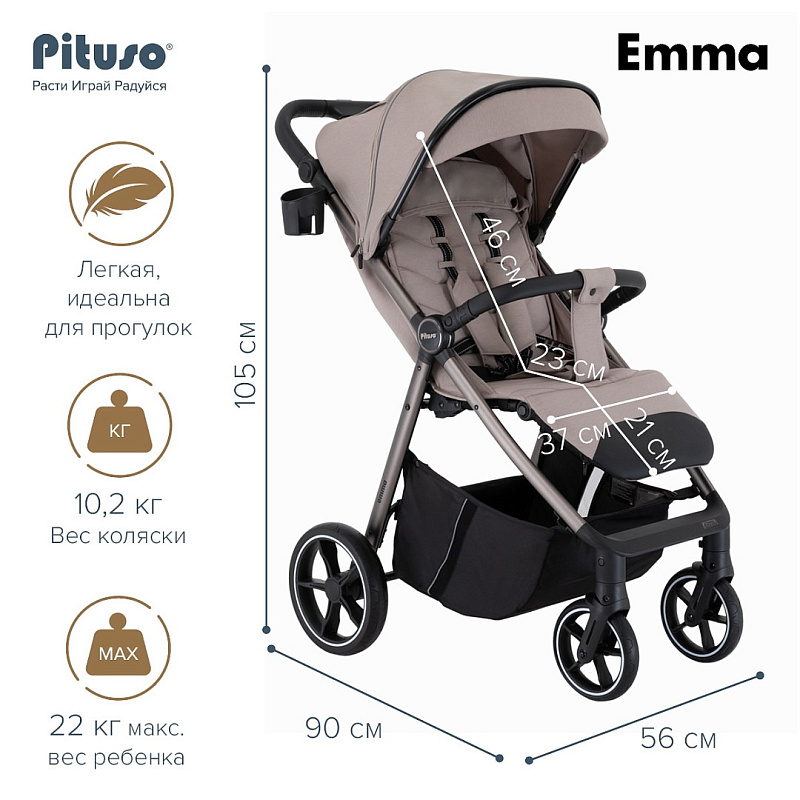 Коляска Pituso Emma идеально подходит для ежедневных прогулок с малышом благодаря своей лёгкости и манёвренности. Регулируемая спинка, включая горизонтальное положение, позволяет ребёнку комфортно спать во время прогулки. Пятиточечные ремни безопасности надёжно фиксируют даже самых подвижных малышей, а большой капюшон защищает от непогоды и палящего солнца.