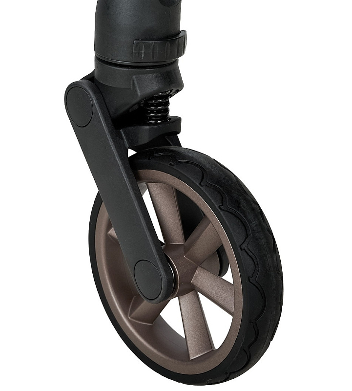 Отличная маневренность и плавность хода. Шасси имеет мягкую подвеску и шариковые подшипники на каждом колесе. Задние колеса диаметром 15 см. Передние колеса диаметром 13см с амортизацией и функцией блокировки.