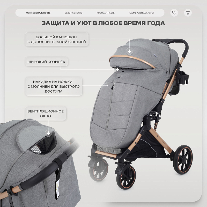 глубокий капюшон с дополнительной скрытой секцией защитит от яркого солнышка, ветра и осадков