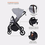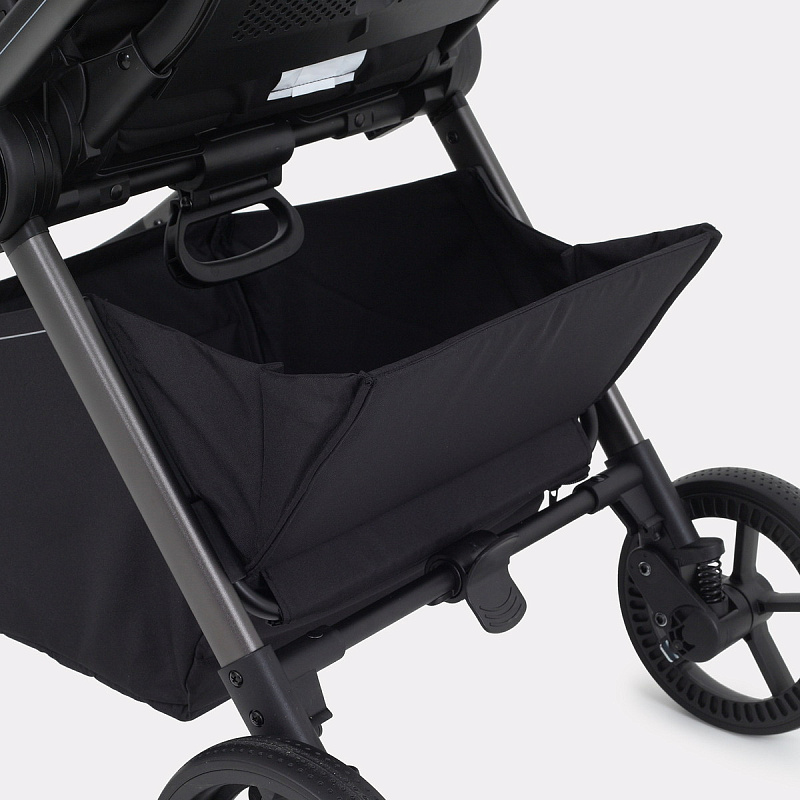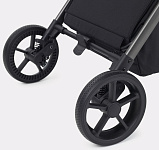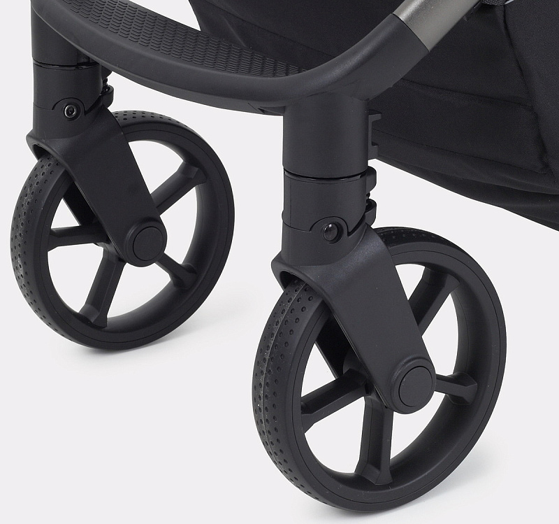 - колеса, выполненные из цельной резины, и амортизация как на передних, так и на задних колесах дарят коляске мягкий ход и абсолютную проходимость