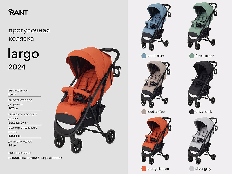 Удивительные расцветки, сиденье с рельефной обивкой и многофункциональность - делают детскую прогулочную коляску RANT LARGO 2024 настоящим фаворитом этого сезона! Модель покорит вас: большим вентиляционным окном в изголовье; множеством регулировок (капюшон, спинка, подножка); объемной корзиной; наличием подстаканника.
