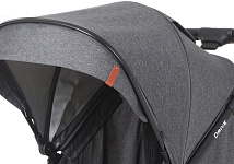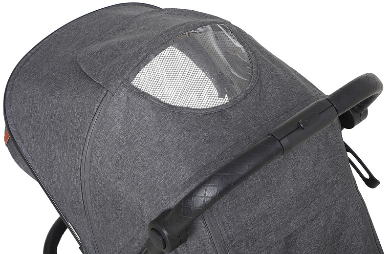 Для комфорта малыша уровень наклона спинки коляски (до лежачего) и положение капюшона (от открытого до глубокого) регулируются плавно и бесшумно в нужное положение. В верхней части капюшона расположена скрытая секция на молнии, увеличивающая капюшон до бампера. Дополнительный козырёк защищает от солнечных лучей. Специально, для прогулок в жаркие дни, в изголовье имеется вентиляционное окно, защищённое москитной сеткой и для удобства открывающееся с двух сторон двумя молниями. В открывающей секции вшит объёмный карман для телефона, ключей и др. предметов. В верхней части капюшона для зрительного контакта с малышом, расположено дополнительное смотровое сетчатое окошко с защитной плёнкой, фиксируемое на скрытый магнит. Нижняя часть подножки защищена эко кожей.