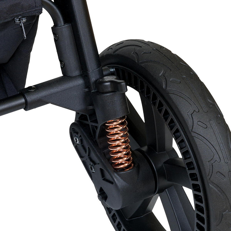 Коляска обладает превосходными характеристиками, в том числе мягкостью хода, которая достигается новыми, инновационными, не прокалываемыми колесами и независимой амортизацией для всех 4х колес. Передние поворотные колеса – с возможностью фиксации, для передвижения по бездорожью. Задние колеса увеличенного диаметра имеют регулировку жесткости, для различного типа покрытия дороги.