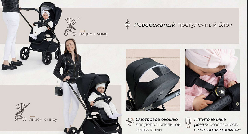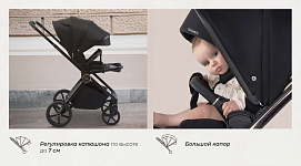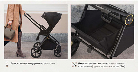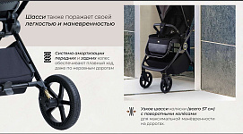 Невероятно легкое и удивительно маневренное шасси, всего 58 см в ширину, легко собирается с прогулочным блоком, который можно вращать как к окружающему миру, так и к родителю. Управление коляской становится легким благодаря алюминиевой раме и поворотным передним колесам. Для комфортной поездки по неровной местности есть амортизация передних колес и мягкие пружины на задней оси. Уникальная система складывания коляски обеспечивает удобство в переноске и хранении. Корзина с магнитным креплением легко увеличивается для удобного хранения вещей.