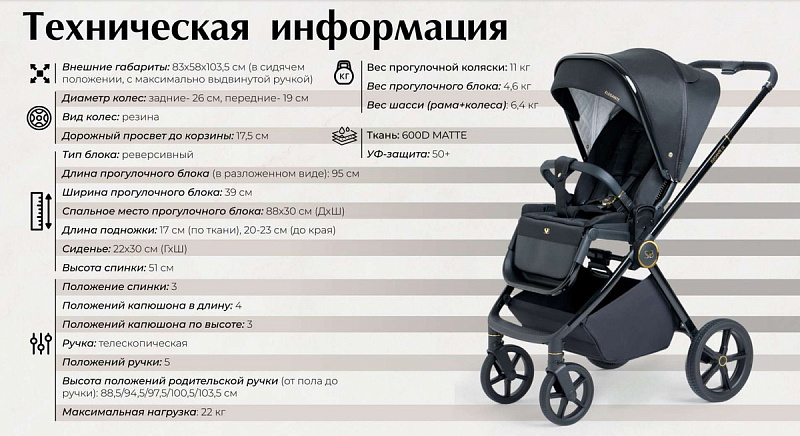 Основными преимуществами этой коляски являются удобство использования и практичность. Благодаря специальной рукоятке над корзиной, Рама легко складывается, обеспечивая максимальную грузоподъемность корзины в 3 кг и создавая пространство для нужных предметов. Кроме того, в сложенном состоянии коляска компактна и подходит для любого багажника автомобиля. Ее размеры составляют 58х30х63 см. Техническое оборудование также имеет свои характеристики. Например, у коляски есть пять вариантов положения телескопической ручки. Вес прогулочного блока составляет 4,8 кг, а его размеры в сидячем положении с выдвинутой ручкой равны 83х58х103,5 см.