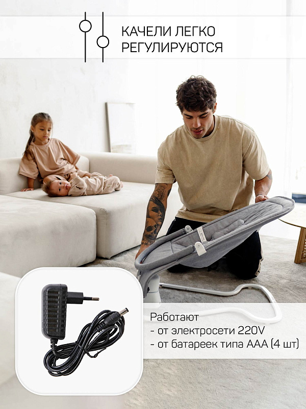 Чтобы обеспечить питание электрокачелей, вы можете использовать адаптер питания, который входит в комплект, или установить 4 батарейки типа ААА (в комплект не входят). Таким образом, вы можете использовать качели даже в отсутствие электричества или в поездках.