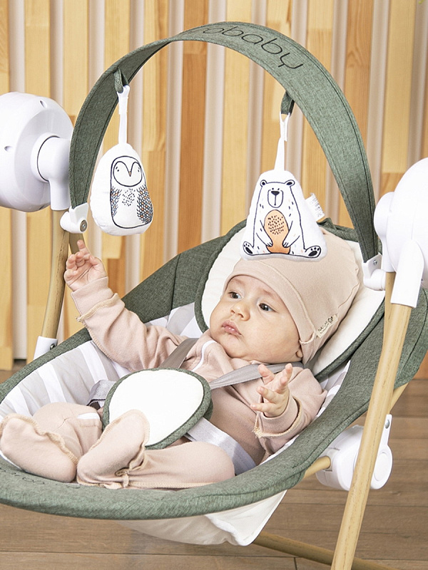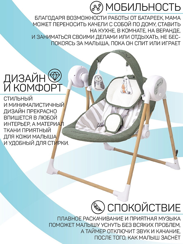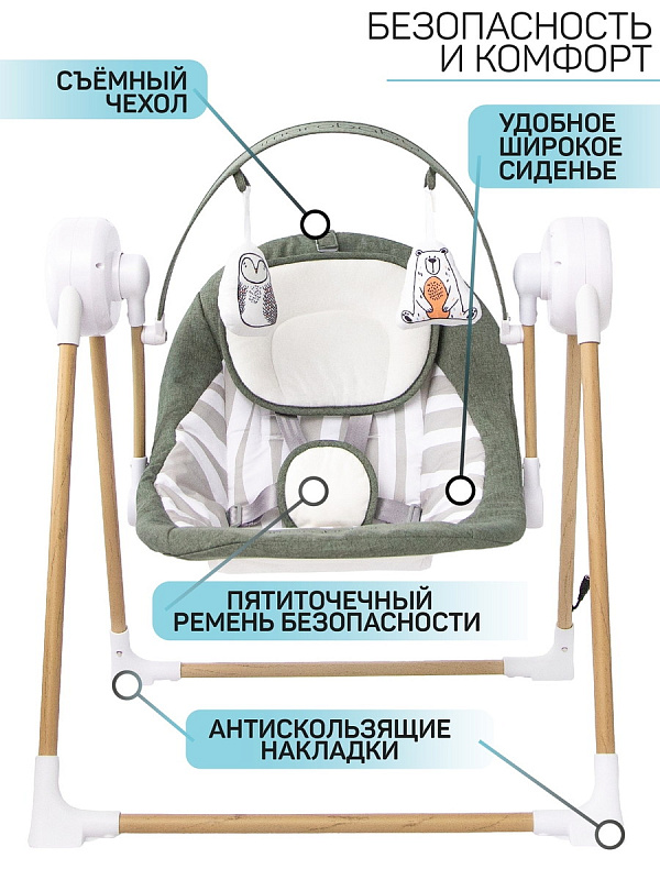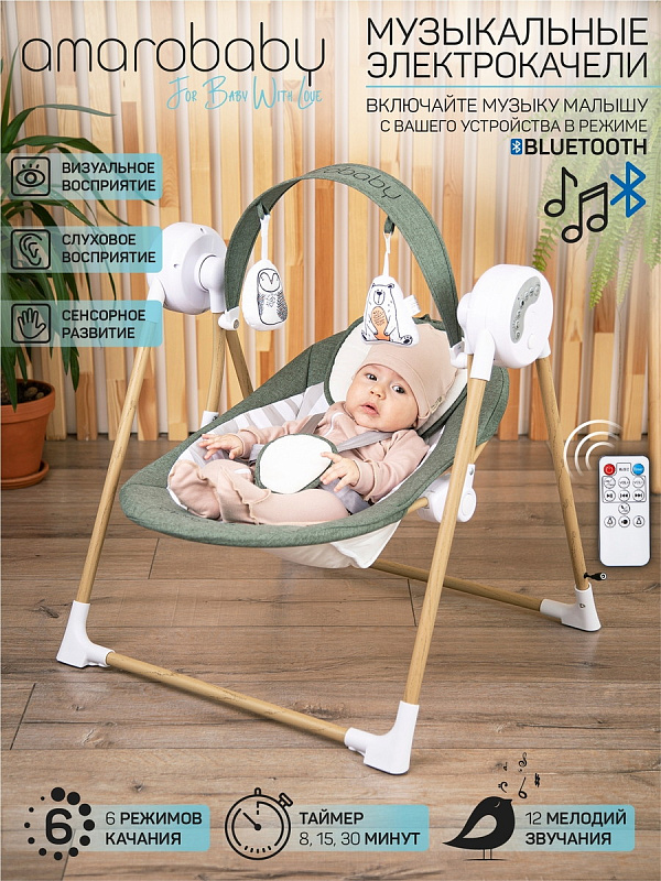 Электронные качели AmaroBaby WOODEN SWING станут полезным помощником в жизни каждой мамы. Выберете любимую мелодию из предложенных или включите детские песенки с телефона с помощью воспроизведения музыки через функцию BLUEТOOTH. Ремни безопасности надежно удержат ребёнка в электрокачелях, а шестискоростной режим укачивания подстроится под личные особенности сна каждого младенца. Ну а пока малыш не заснул, он может поиграть с очаровательными мягкими игрушкам, которые закреплены в непосредственной близости от ребенка. Такая игра хорошо развивает мелкую моторику рук и способствует раннему развитию.Установите таймер качания на 8, 15, 30 минут и функция включения качелей при шуме плача поможет вам запланировать режим работы качелей.
